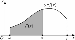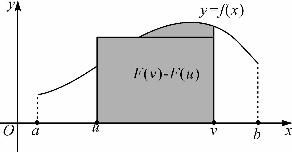 再看图2-2.将函数f(x)的曲线和x轴之间在[a,x]上方的这块曲边梯形面积记作F(x).则图2-3中[u,v]上这块曲边梯形面积为F(v)-F(u).如果把这块曲边梯形面积去高补低折合成长为v-u的矩形,则矩形的宽应当在f(x)在[u,v]上的某两个函数值f(p)和f(q)之间.这表明f(x)是F(x)的乙函数.