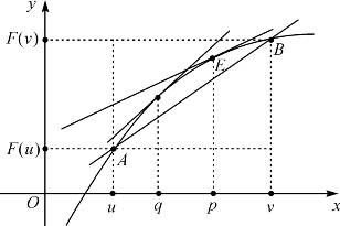 如图2-1,在函数y=F(x)的曲线上取两个点A=(u,F(u))和B=(v,F(v)).如前所述,割线AB的斜率是F(x)在[u,v]上的差商.设曲线上横坐标x=p的点E处的切线的斜率为k(p).直观上看k(p)有时大于割线的斜率,有时小于割线的斜率.把切线的斜率看成切点横坐标x的函数k=k(x),按定义它是y=F(x)的乙函数.