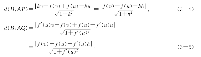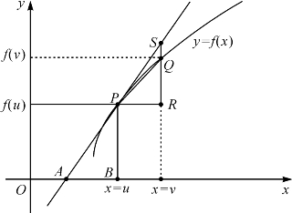 设B=(v,f(v))是曲线y=f(x)上另一点,如图,分别计算它到AQ和AP的距离.记h=v-u≠0,可得