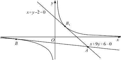 整理后得二次方程u2+2u-3=0,解得u=-3或u=1,即切点可能是B或B1(1,1);所以满足要求条件的切线有两条,用两点式直线方程写出整理后分别为x+y-2=0和x+9y+6=0,如图3-3.