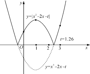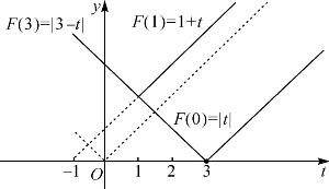 当f(x)=x2-2x-t的最小值-1-t<0时即t>-1时,F(x)=|x2-2x-t|在x0=1∈(0,3)处取到极大值1+t>0,如图4-2.于是F(1)=1+t、F(0)=|t|和F(3)=|3-t|中较大者为所求的最大值.有三种情形:(1)当t∈(-1,1)时F(3)=|3-t|>2显然为最大;(2)t=1时F(1)=2=F(3)同为最大值;(3)t>1时F(1)=1+t为最大.这三种情形如图4-3.