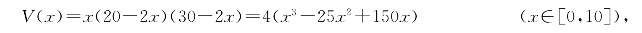 例题4—4 如图4-10是一张长为30cm、宽为20cm的矩形纸片.从虚线处将四边折叠并适当粘贴起来构成一个高为xcm、长为(30-2x)cm、宽为(20-2x)cm的无盖纸盒(图4-11).问纸盒的高是多少时容积最大?容积最大是多少?