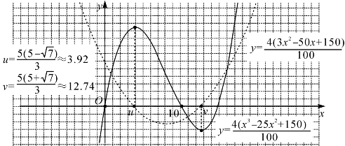 而g(x)=4(3x2-50x+150)是V(x)的乙函数,如图4-12.求出g(x)=0的两根为u=≈3.92和v=