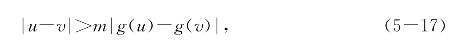 证明 对于[A,B]中任意两数u和v,令a=g(u)、b=g(v);因为g(x)是f(x)的一个反函数,故a=g(u)、b=g(v)都在I中,且f(a)=u与f(b)=v不同.这时不等式(5-16)成为