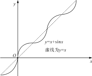 例题5—6 求证函数f(x)=x+sinx在(-∞,+∞)上递增,且其曲线上过任意两点的割线斜率小于2(图5-3).