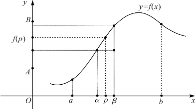 记d=min{|f(p)-A|,|f(p)-B|},δ=Md,则当x∈(p-δ,p+δ)时总有|x-p|<δ=,从而|f(x)-f(p)|≤M|x-p|<Mδ=d,即f(x)∈(A,B).令α=p-δ且β=p+δ,即为所求(图5-4).