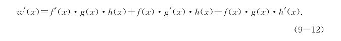 例题9—4 (取对数求导法)已知f(x)、g(x)、h(x)都在I上强可导且不为0,令w(x)=f(x)·g(x)·h(x),求w(x)的导数.