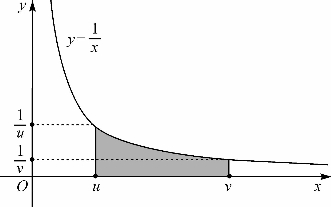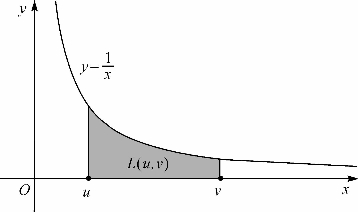 从而可知lnv-lnu=L(u,v),且当u<v时它就是y=曲线下在区间[u,v]上的面积(图9-3),从而得到下面的重要命题,