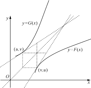 从几何上看,如图10-3.F(x)的图象和G(x)的图象关于直线L:y=x对称,曲线y=G(x)上的点P=(u,v)和曲线y=F(x)上的点Q=(v,u)对称,两点处的切线也对称,从而其切线斜率互为倒数.