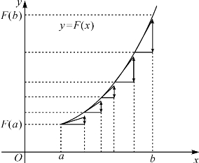 从(16-6)到(16-11),这个推导过程并不依赖图16-1.图16-1把f(x)曲线形成的曲边梯形的面积分割作为几何模型,是黎曼提出来的.林群直接考虑F(x)的曲线,提出了一个更简单的几何模型(见光明日报1997-6-27,人民日报1997-08—06或《微积分快餐》8、19、39页,或《微积分减肥快跑》),如图16-2.图中的曲线是F(x)在[a,b]上的图像,两条相邻竖虚线的距离是Δxk,两条相邻横虚线的距离是F(xk)-F(xk-1),这里的诸ξk取在小区间的左端(此处k=1,2,3,4,5),x0=a,x5=b.斜的直线段是ξk处的切线,而标有双箭头的线段的长度为f(ξk)Δxk.对照图16-2再看从(16-6)到(16-11)的推导过程,感到微积分基本定理竟如此简单.