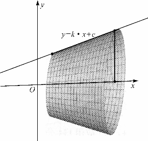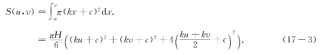 考虑(17-2)中F(x)=kx+c的特殊情形,设k>0,c>0,这时F(x)的图像是一线段,对应的旋转体是高为H=v-u的圆台(图17-2显示出线段旋转生成的圆台侧面).圆台体积S(u,v)的定积分表达式中被积函数是π(kx+c)2.应用114公式(命题16.5)得