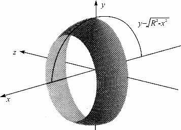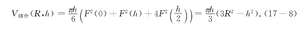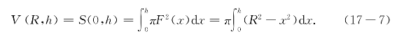 在(17-2)中取F(x)=,x∈[-R,R].函数y=F(x)的图象是半径为R而圆心在原点的半圆.它绕x轴旋转一周生成半径为R的球面.如果取区间[0,h]上的一段圆弧绕x轴旋转,则生成一个下底为球的大圆而高为h的球台的侧面,如图17-3.