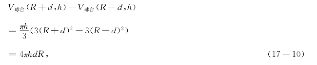 为了计算球台侧面的面积,考虑两个高相等但半径分别为R+d和R-d的两个球台之差所形成的球带壳体的体积(图17-4):