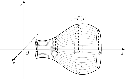 解 如图,旋转体在平面x=u和x=v之间部分的体积S(u,v)关于参数u和v显然满足可加性.想象把这部分体积折合成高为v-u的圆柱,则圆柱的半径必在[u,v]上的两个函数值F(p)和F(q)之间,即