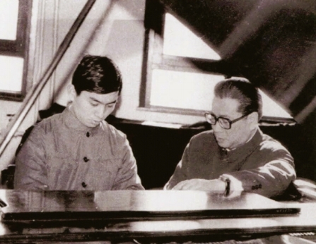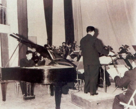 1959年,朱工一(左一)和刘诗昆合奏《青年钢琴协奏曲》