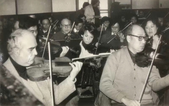 1979年3月,上海交响乐团与波士顿交响乐团联合排练中的柳和埙(前排右)
