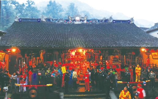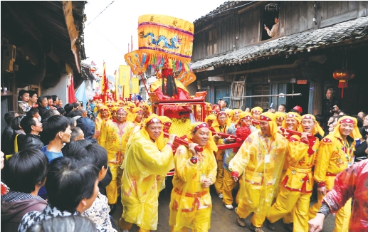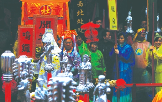 庙会有十九个地方要爵献,其中有两处要“拥菩萨”。所谓拥菩萨就是挑选身强力壮的青年抬着神轿一拥而进至供献处,轿子抬得越快越好,为的是图个好运。按往日规矩,在神娘庙和相子岩两处要专门举办拥菩萨仪式。别说,这拥菩萨仪式,还有不少讲究呢,在神娘庙要由青年来拥,在相子岩则要挑选牧童来拥。