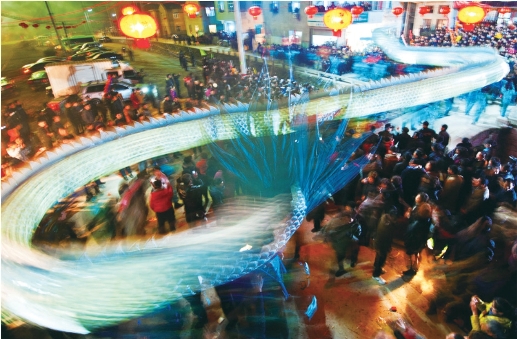 行会队伍从祠堂出发,穿过几条重要的田间小路,再绕村巡游。当大龙穿过村庄时,家家户户都在家门口上香,摆供品,祭礼酒,烧纸钱,磕头膜拜,祈求“吉祥如意,太平无事,风调雨顺,年年丰收”。当双龙行到祠堂前桥时,礼炮、鞭炮声响彻夜空,人们手执火炬,一起聚集在祠堂前。此时,村民们争着观看双龙飞舞的情景,欢呼声此起彼伏。最后,双龙游行队伍,在一片灯光照耀下,徐徐游行至村口外庙(旧时称泗洲沙头庙)。这里是车岙港港尾所在地,有码头,方便外出通航,还是西岙一带商贸交易的重地之一。这里建有庙宇,塑有猴面大帝,凡人们要出海或远行经商,都会先到这里祈求大帝保佑。到此,历时两个多小时的双龙行会宣告结束。