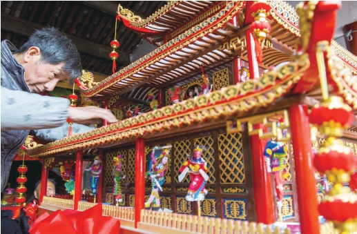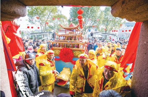 山头村百姓多年来常参加一年举办一次的“灯人会”活动。这是山头村人自娱自乐的娱神活动,该活动自明朝起就历代相沿。山头灯人会一般于农历正月十二至十三日举办。整个活动分“上灯”“出灯”“送灯”三个程序进行。上灯,即在奉祀白鹤大帝的西山殿里陈列“灯人山”,人们依次进献祭祀品;出灯,即抬神巡游,队伍以房、族为单位,捧白鹤大帝牌位,抬出“灯人山”巡游,前后伴随着送灯士和火铳队;送灯,即灯人会结束后,敲锣打鼓向缺少男丁的人家赠送“灯人”。这里的“灯”谐音“丁”,送“灯人”,是希望这户人家人丁兴旺。白鹤大帝是山头灯会的主祭神,这位大帝原是东汉时宁海的道士、医家赵炳。祭神的目的是保佑百姓安居乐业。
