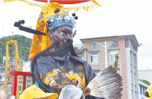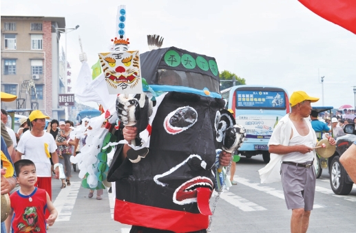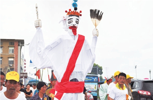 小丑扫街以后,接着的是火铳队、旌旗队、锣鼓队。再后的是“矮和尚”和“长和尚”。石浦人把“矮和尚”和“长和尚”称作“矮菩萨”和“长菩萨”。“矮菩萨”也叫“短无常”,其头大如箩,个子极矮,漆黑的脸,穿黑色的袍,手执勾魂板和铁链条,一路上用力抖动着铁链条,发出“嗦啷”“嗦啷”的响声。他们有时走得慢,有时走得快,有时疾步如飞,很是吓唬人。“长和尚”就是“长无常”,也称“白无常”,身穿白长袍,面上红舌头伸出一尺来长,行动极慢,给人阴森恐怖的感觉。石浦城隍庙的黑白无常同其他城隍庙的一样,面目狰狞,恐怖万分。据说这是为了警诫世人要做好人,否则黑白无常就会把你押到阎罗王那里去。在法制不健全的社会,用“无常”来恐吓世人,还是有一定的文化教育意义的。