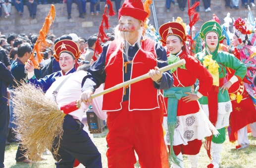 紧跟“无常”之后的是“肃静”“迴避”方牌,方牌之后,是戚老爷和城隍菩萨的神龛。神龛后是一支细十番乐队,乐队后是表演队伍。有踏高跷、抛瓷瓶、打飞叉的,还有化装扮演的糊涂官、老塾师、疯僧、醉汉、媒婆等各式人物。而最引人注目的是一对“大头公公”和“大头婆婆”,这俩“大头”一路打情骂俏的表演,令大街两边围看的人们捧腹大笑。队伍最后是制作精致的“四境抬阁”,抬阁上是各色戏剧人物,煞是好看。