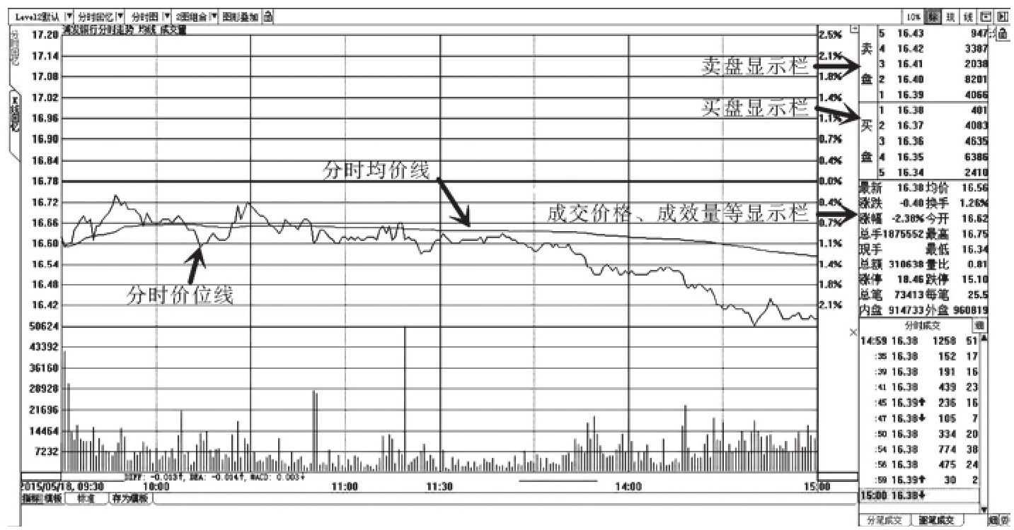 图1-2为2015年5月18日浦发银行分时走势图,其中涉及以下几个专业词汇: