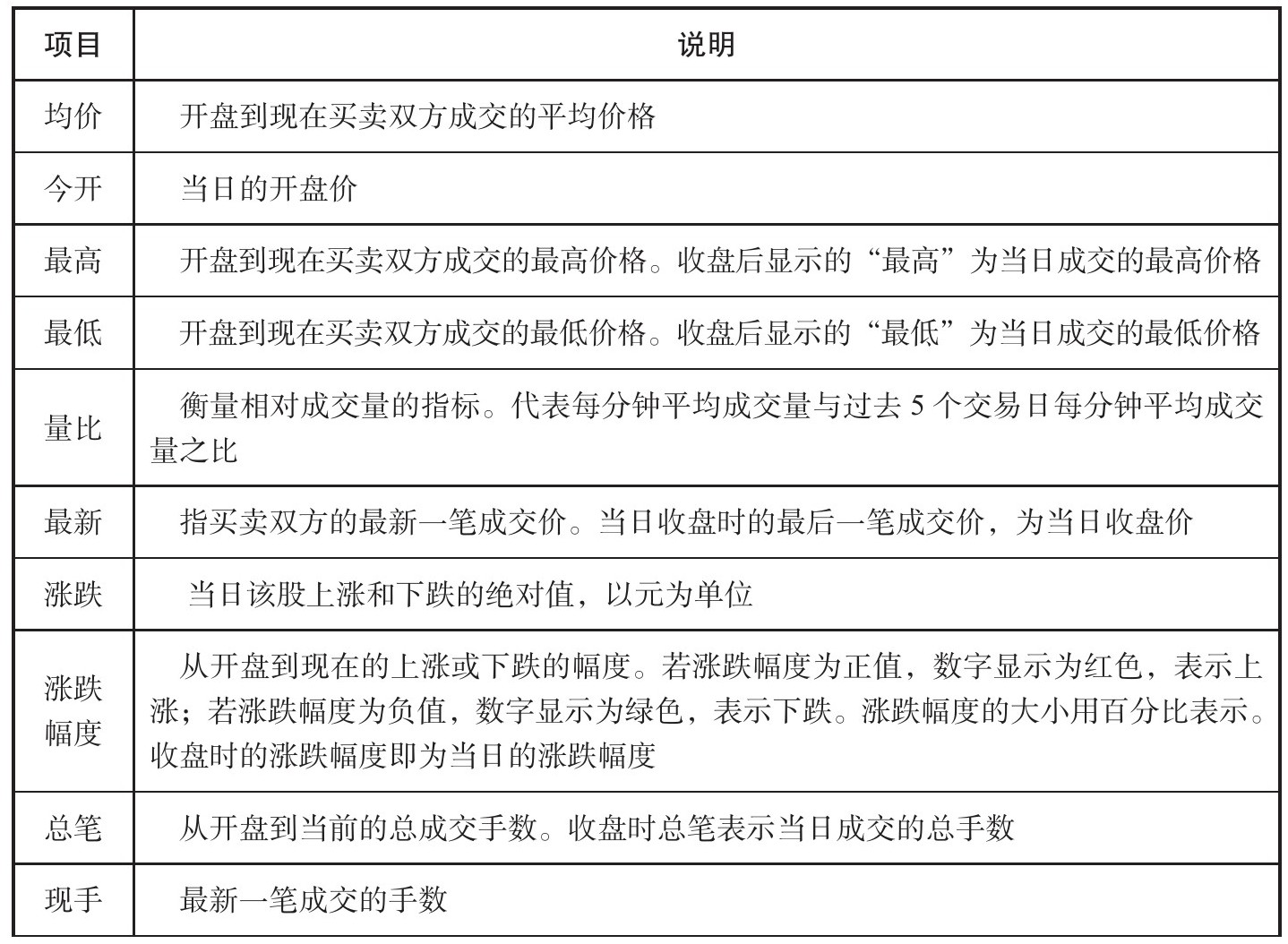 (5)成交价格、成交量等显示栏,如表1-2所示。