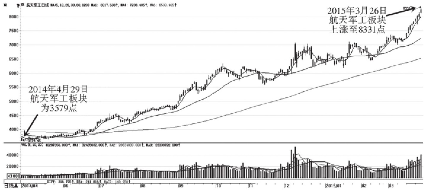 2014年的股市终于从熊市中苏醒。作为带有高科技色彩的航天军工板块更是火得“一塌糊涂”,这不仅仅是因为其有着国防建设的深厚背景,还因为科技发展关系国家的发展,关系到个人的前途和命运。因此,航天军工板块指数从2014年4月29日的3579点攀升到2015年3月26日的8331点,涨幅达132.77%(图1-5)。