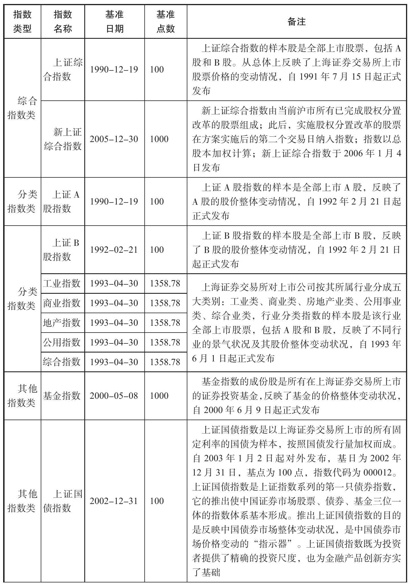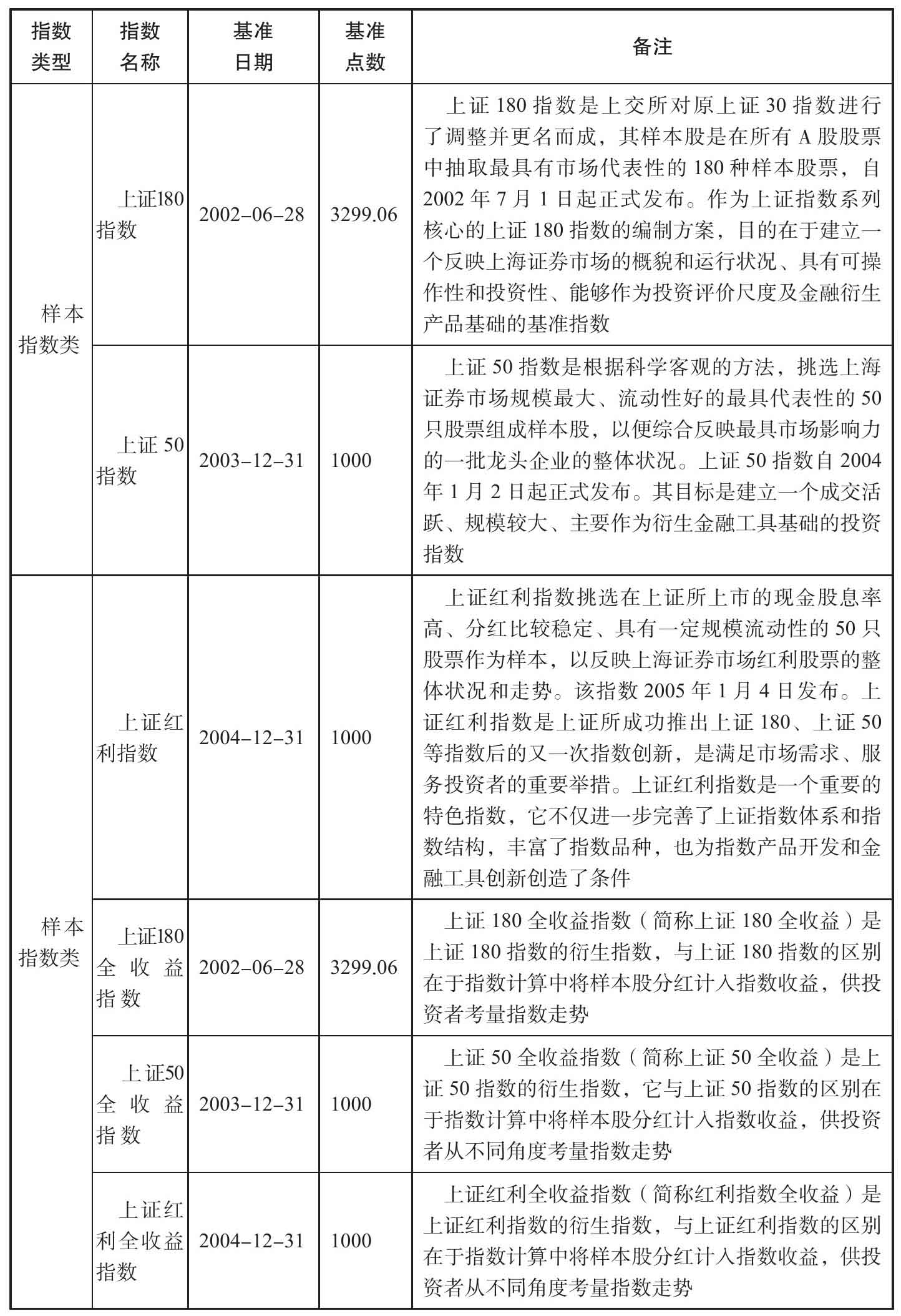 2002年6月,上海证券交易所对原有的上证30指数进行了调整,并正式更名为上证成分股指数,简称上证180指数。这次调整推动了证券市场基础建设的长远发展和规范化进程,更是结合了中国证券市场发展的现状,并借鉴了国际经验,旨在通过科学客观的方法挑选出最具代表性的样本股票,建立一个能反映上海证券市场概貌和运行状况,并且能够作为投资评价尺度及金融衍生产品基础的基准指数(表1-4)。