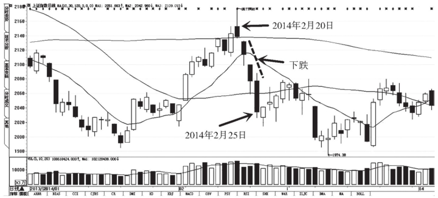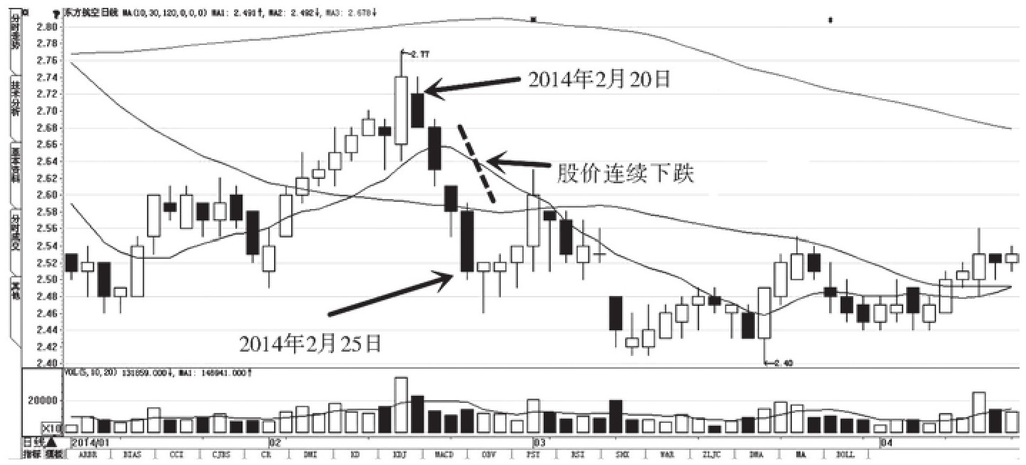 2014年2月16日,尼泊尔航空的一架DHC-6双水獭飞机在尼泊尔博克拉丛林西南方74千米的林地坠毁。次日,南苏丹又发生了一起货运飞机坠毁事故。受接连发生的国际航空事故影响,东方航空(股票代码:600115)股价在随后的几个交易日内连续下跌(图2-7)。重大突发事件的特点就是牵动性极强,在一系列的股市反应后,整个大盘往往会受到波及(图2-8)。