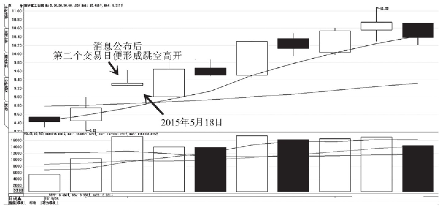 振华重工(股票代码:600320)是重型装备制造行业的知名企业,控股方为世界500强之一的中国交通建设公司。在权威媒体的消息刺激下,该股在消息播出后的第二个交易日就形成了跳空高开的现象(图2-10)。