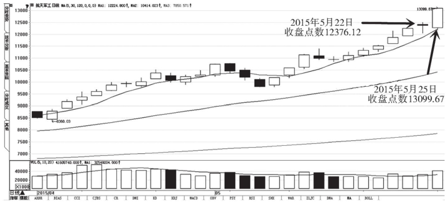 2015年5月23日,中国军队按照相关计划,在南海举行一场异常激烈的实战军演,参战部队昼夜不停开炮,一时间吸引大量目光聚焦南海。这次军演在展现中国军队强大军事实力的同时,也在股市中产生很大的影响,5月25日航空军工板块以一根很长的阳线收场,较前一日提升723.55点(图2-11)。