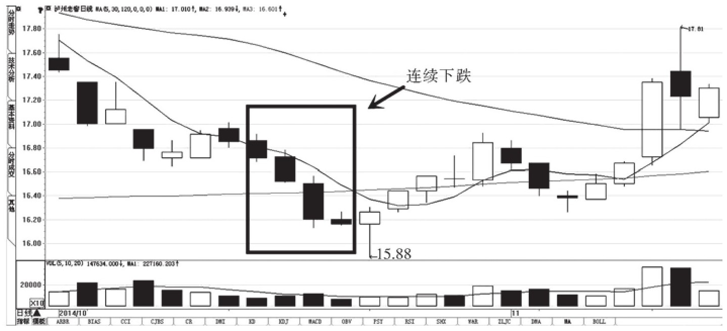 2014年10月21日晚,泸州老窖(股票代码:000568)公布第三季度财务报告。第三季泸州老窖的营业收入和净利润分别是11.37亿元和2.86亿元,同比下滑60.81%和67.64%。对于还没有脱离“存款蒸发”影响的泸州老窖公司来说,无疑是雪上加霜,在大盘中表现为连续下跌(图3-1)。
