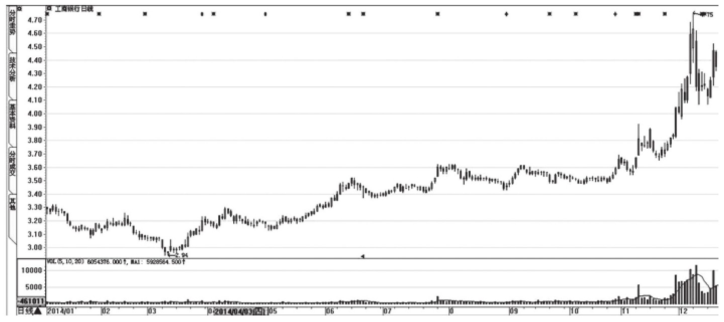 中国工商银行良好的基本面是支撑其未来发展的最有效保障,不论短期这只股票的股价如何波动,但终究会上涨的态势在2014年的大盘中一览无遗(图3-2)。