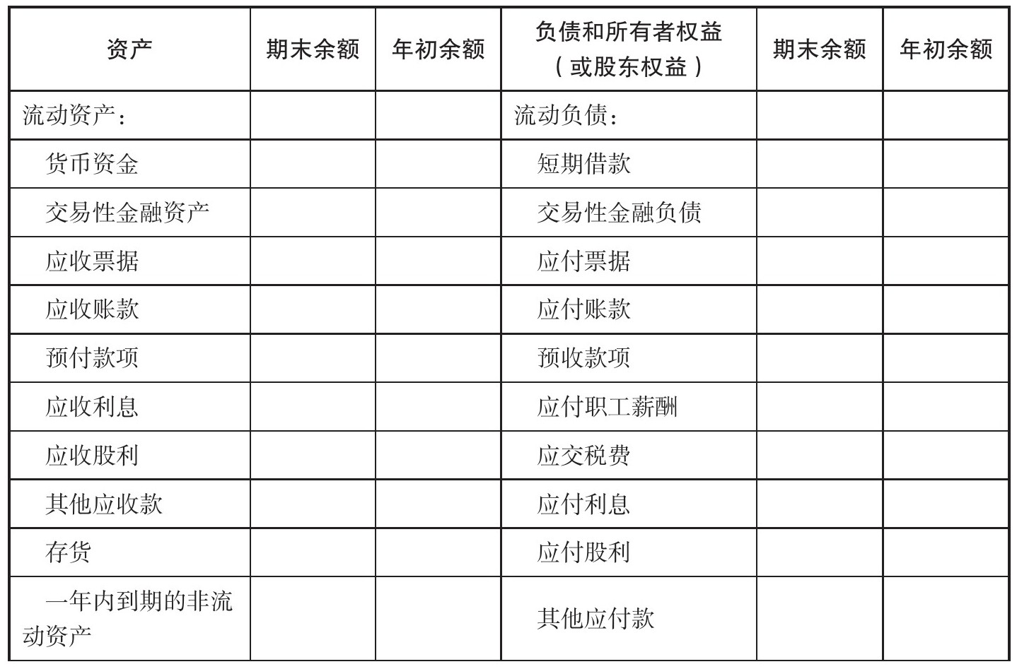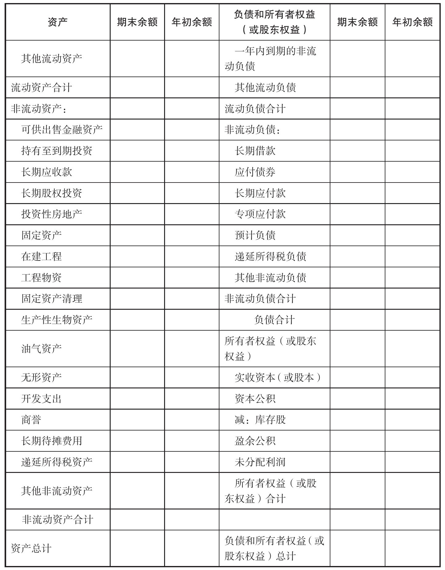 资产负债表集中概括了公司在某一特定日期所拥有和控制的经济财产、所承担的经济义务和所有者对净资产的要求权。它是依据“资产=负债+所有者权益”这一会计恒等式编制而成,报表中按照资产、负债和所有者权益分类分项反映。我国的资产负债表采用账户式的格式,左侧列示资产,右侧列示负债和所有者权益。资产中所有项目合计要等于负债和所有者权益所有项目的合计,即资产负债表中的左右两侧平衡(表3-3)。