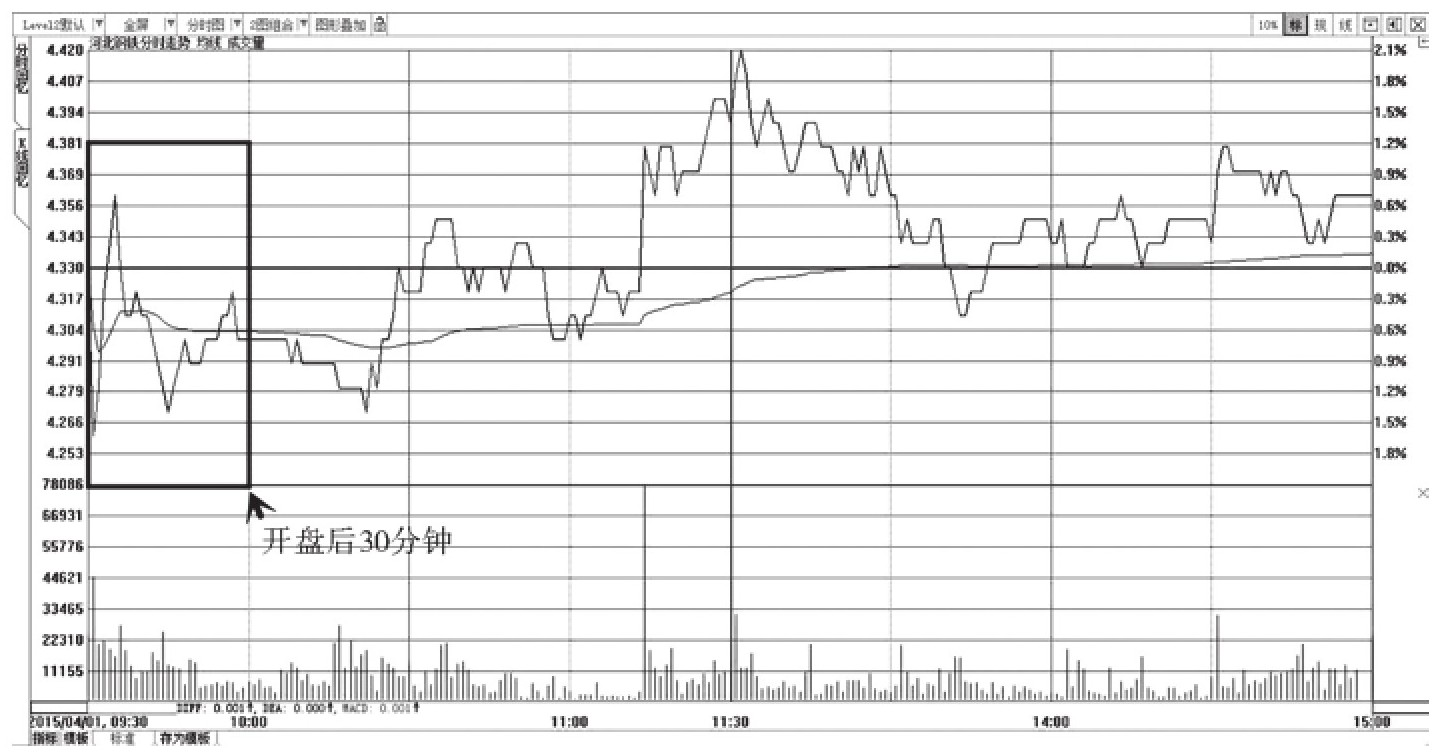 每个交易日开盘后的三个10分钟被众多股民称为开盘“三板斧”,之所以被如此称呼,是因为开盘后的三个10分钟在一个交易日的行情中具有非常重要的地位,可以说这“三板斧”直接雕刻出一个交易日走势的基本框架(图4-5)。