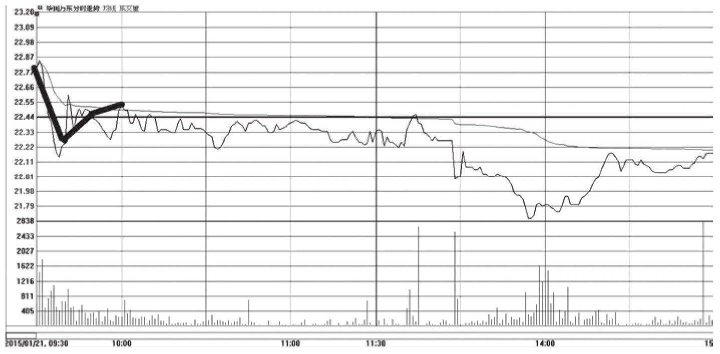 开盘价是多空双方都比较认可的结果,也是多空双方的均衡点。为了能够正确地把握大盘走势的特点与规律,可以将开盘时间作为起始点,将开盘后的第10分钟、20分钟、30分钟指数或者价位移动点连成可以得到三条线段,其中第二条线段的走势形态,就可以当作当天股价整体走势线,而第三条线段则可以当成是当天股价在分时走势图上的日均线的走势形态(图4-8)。