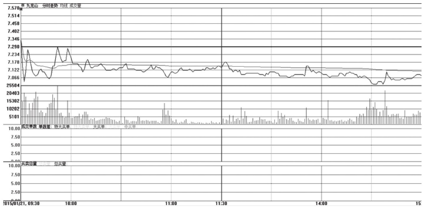 在开盘后的第一个10分钟里,多方为了能够顺利地吸收更多的货,会迫不及待地抢进筹码;而空方为了能够加大自己的收益,也会故意拉高股价派发。这样的现象造就了股价在开盘后就急速高走,这种情况多发生在牛市;如果整体行情较“熊”,那么多方为了吸收到更多便宜的筹码,会在这个时间段内大肆打压股价,空方和散户迫于形势压力,会不顾一切地抛出手中的筹码,从而导致了股价开盘就下跌的现象(图4-6,图4-7)。