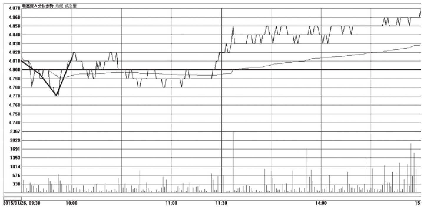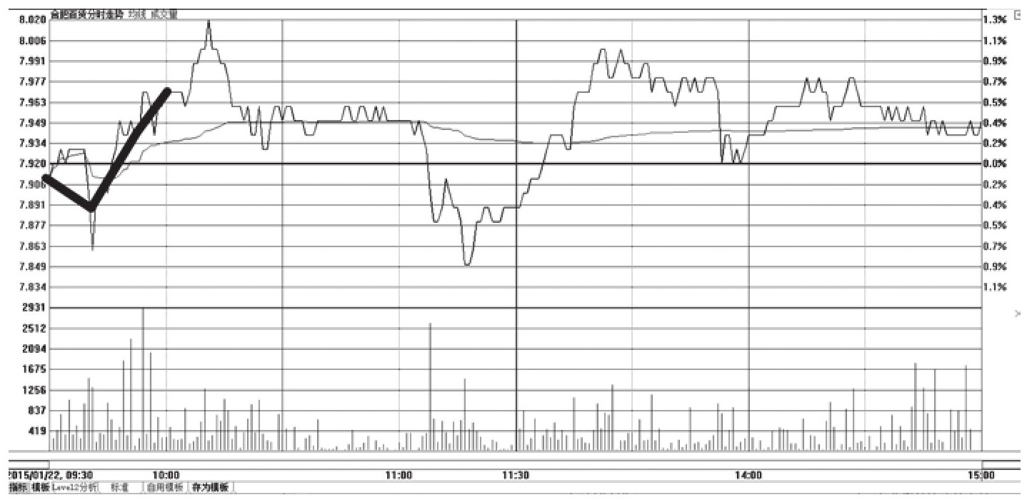 (3)三线呈一下二上的状态。9点40分的时候股价下跌至开盘价以下的位置,但是9点50分和10点都停留在了开盘价之上的位置,并且后者高于前者,这种情况表明后市很有可能会出现震荡上升的行情(图4-11)。