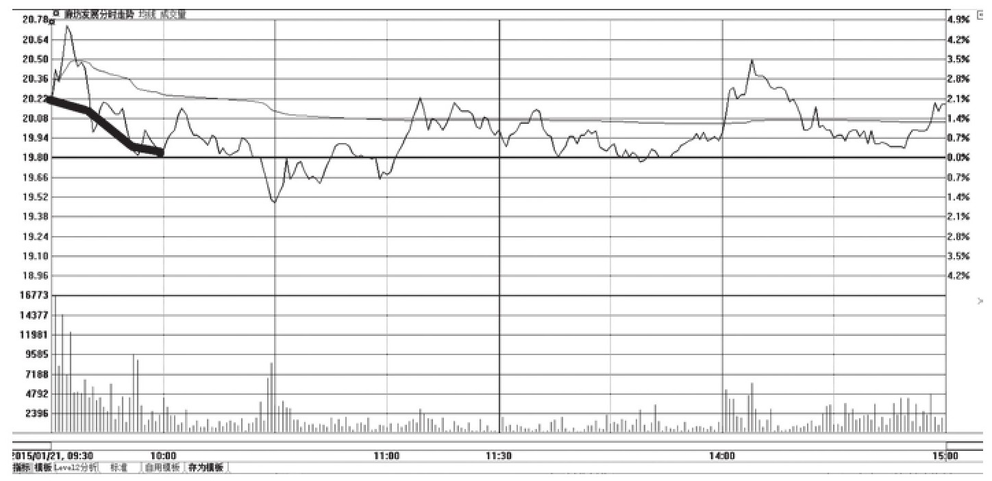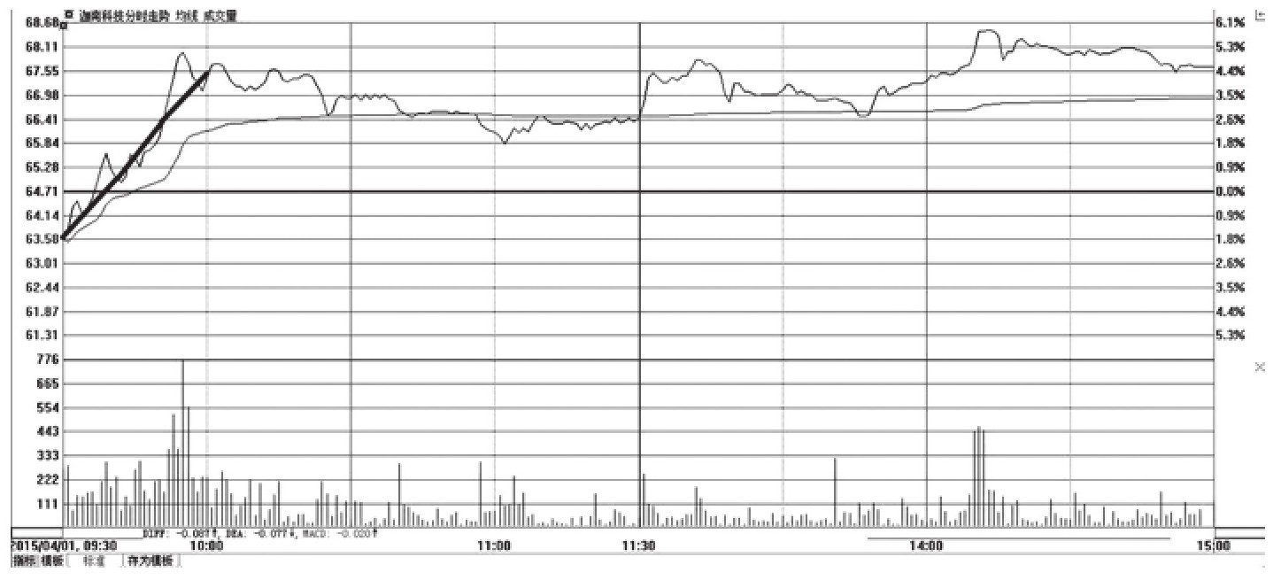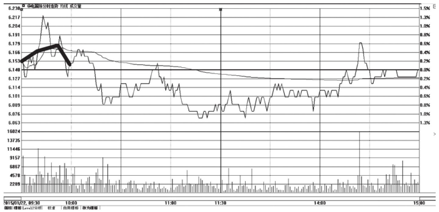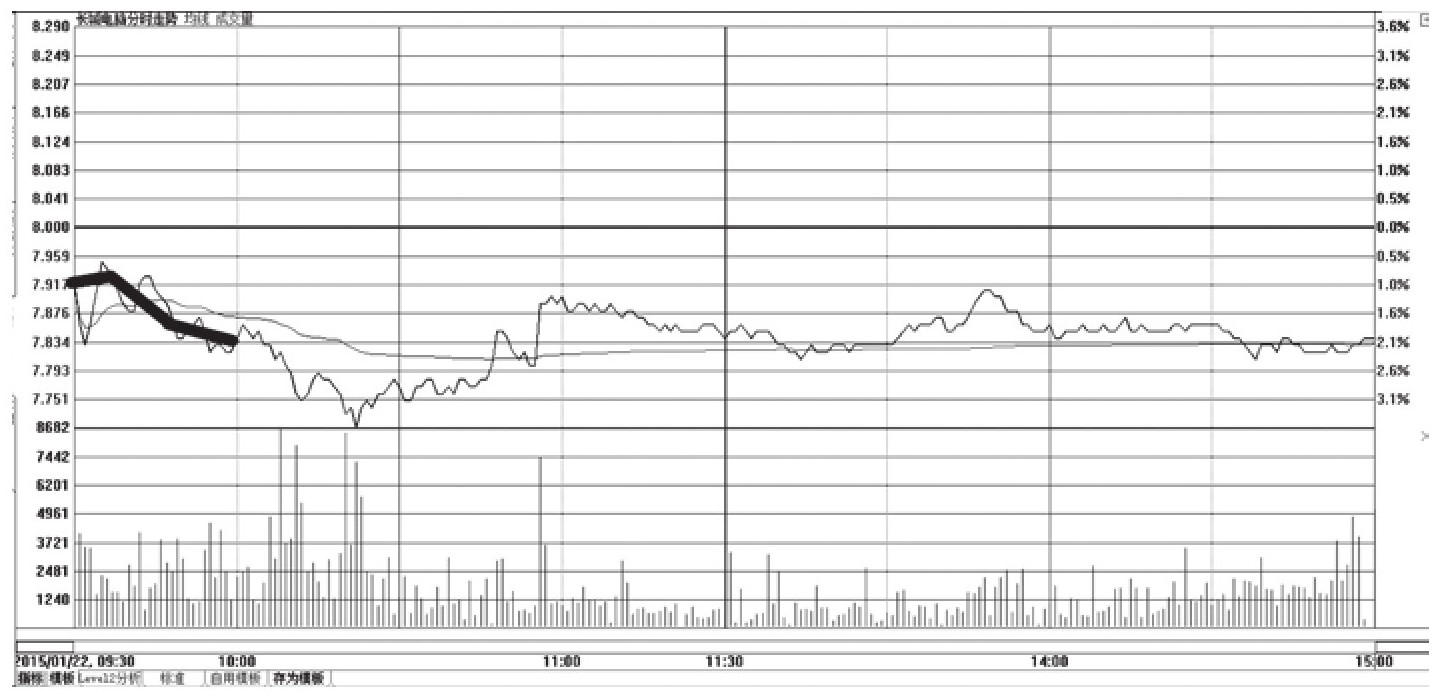 (6)三线呈二上一下的状态。即9点30分到9点40、9点50分时,线段的走势都是向上的,且股价均大于开盘价,但在10点时,股价又下跌到开盘价之下,这表明当天行情会以震荡为主(图4-14)。