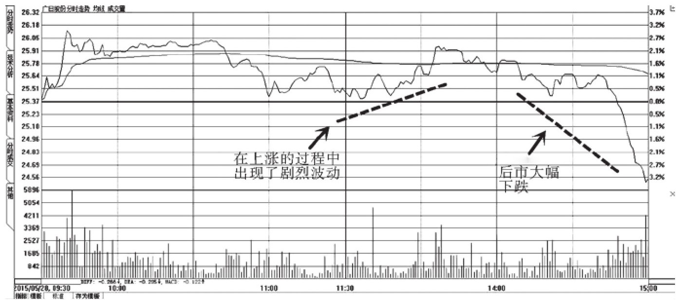 广日股份(股票代码:600894)股价在2015年5月28日11点30分至14点期间,在上涨的过程中出现了频率比较高、幅度比较大的波动,这意味着该股后市很可能会出现下跌,该股后市的走势图也印证了这种推断(图4-16)。