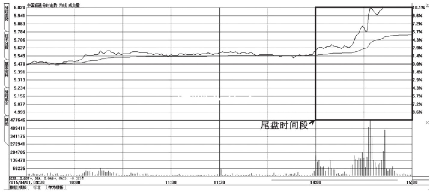 14点30分到15点是尾盘的时间段,作为一天战斗的总结阶段,尾盘向来被股民所重视。如果开盘是序幕,盘中是表演过程,那么尾盘才是结局定论。尾盘之所以有如此重要的地位,是因为它不仅有着承前启后的作用,又能预测第二个交易日的基本行情趋势(图4-18)。