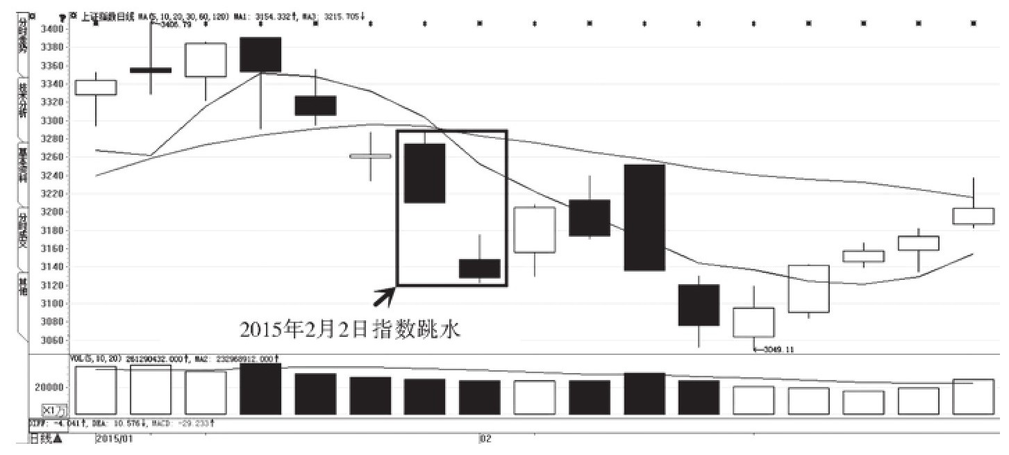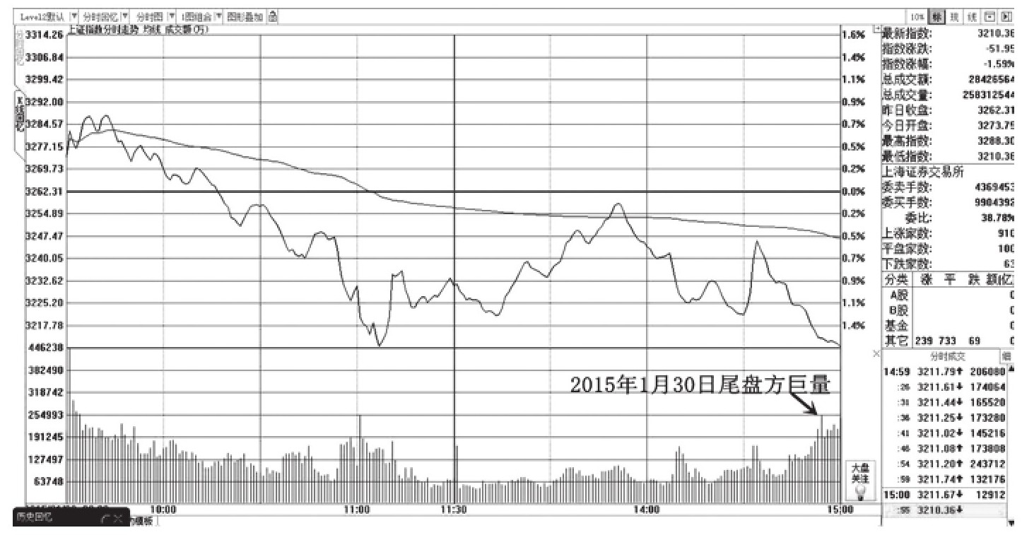 在经过一段深度下跌后,上证指数于2015年1月30日形成尾盘放巨量的现象,从这一现象我们可以推测在第二个交易日上证指数很可能出现跳水的现象。反观上证指数的K线走势图,可以看到在第二个交易日确实出现了跳水现象(图4-20,图4-21)。