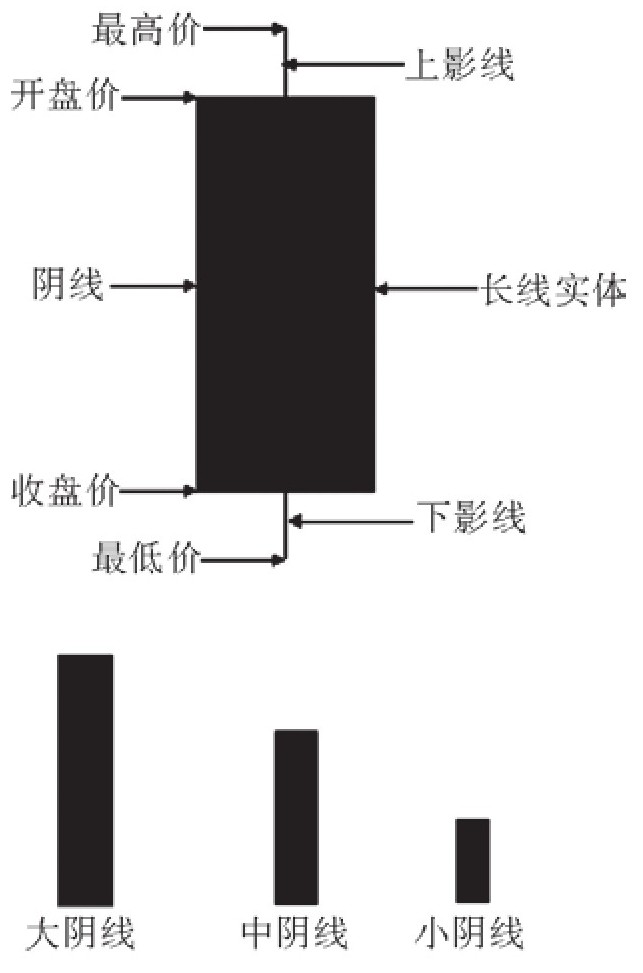 K线记录了每天的开盘价、收盘价、最高价以及最低价,所有的K线都是根据这4个价格来绘制的。开盘价和收盘价以一小段横线来表示,再将它们之间用两条竖线连成一个矩形实体。开盘价高于收盘价时,矩形用白色柱体表示,称为阳线;开盘价低于收盘价时,矩形用黑色柱体表示,称为阴线。