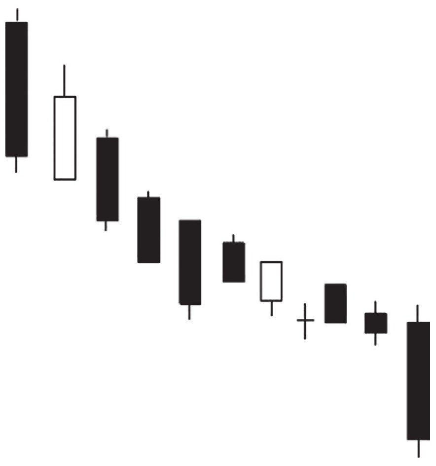 这种形态看上去每天的跌幅不是很大,它却预示着后市股价的走势将会变得非常不乐观,甚至有可能长时间持续走弱。投资者对这种形态一定要保持高度警惕。