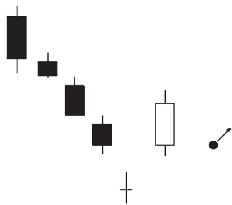 若股市处于下跌的行情中,出现了跳空十字线,而后又跳空收出一根大阳线形成独立大阳线形态,这种走势说明买方即将发力使股价向上反弹,投资者可以选择买进股票(图5-15)。