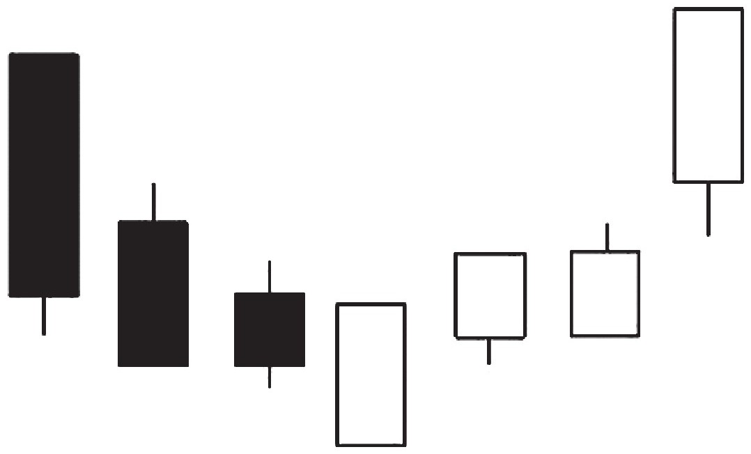 圆底形态是指股价在图形中呈现圆弧形,多由小阴线、小阳线组成,以向上的跳空缺口确认其成立(图5-19)。