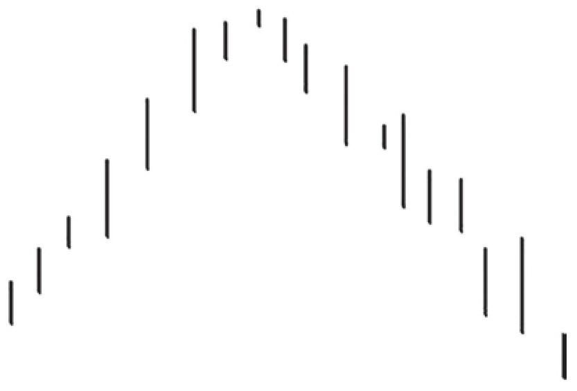 K线图中收出一根长阳线,而后出现连续的几根小阳线或小阴线,使涨势缓和下来,最后出现一根向下的大阴线或大阳线,便完成了塔形顶形态。这种形态一般出现在上涨行情中(图5-22)。