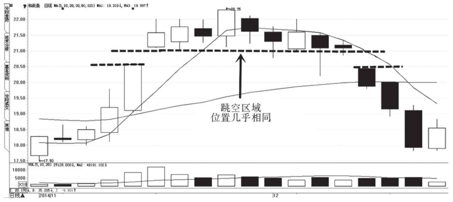 在经过一段上涨行情后,和而泰(股票代码:002402)股价于2014年11月24日形成向上跳空现象,虽然这一现象代表着股价大幅上涨,但是好景并没有持续下去。在该股形成向上跳空后,股价虽然也进行了小幅上涨,但是在上涨后,该股便开始由升转跌,并且又形成了向下跳空,其形成缺口的位置与之前向上跳空形成的缺口位置几乎相同,整体走势具备了顶部岛形形态的特点。从图5-27中可以看到,在经过了顶部岛形的“洗礼”后,该股便开始大幅下跌。