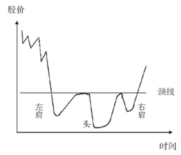 头肩底同样是一种典型的反转形态。股价下跌的时候形成左肩,成交量相对增加,之后出现一次成交量较小的上涨态势。而后股价再次下跌,跌破上次的最低点,成交量增加。